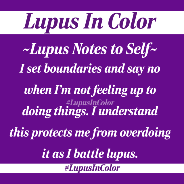Lupus Notes to Self: I set boundaries and say no when Iām not feeling up to doing things. I understand this protects me from overdoing it as I battle lupus. #LupusInColor
