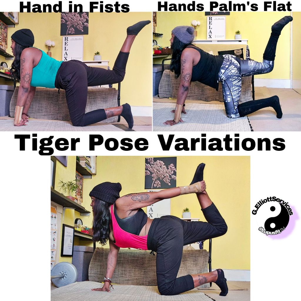 Combining the two forms (yoga & fitness) of exercise styles, Donkey Kicks (fitness) & Tiger Pose (Yoga), which have similar starting positions on all four’s. Also, the trajectory (direction) of the lifting leg is the same. Also, they both serve as great glute exercises & hip extensions. Plus muscle toning, strengthening & stretching the largest major muscle group of the buttocks (gluteus maximus).